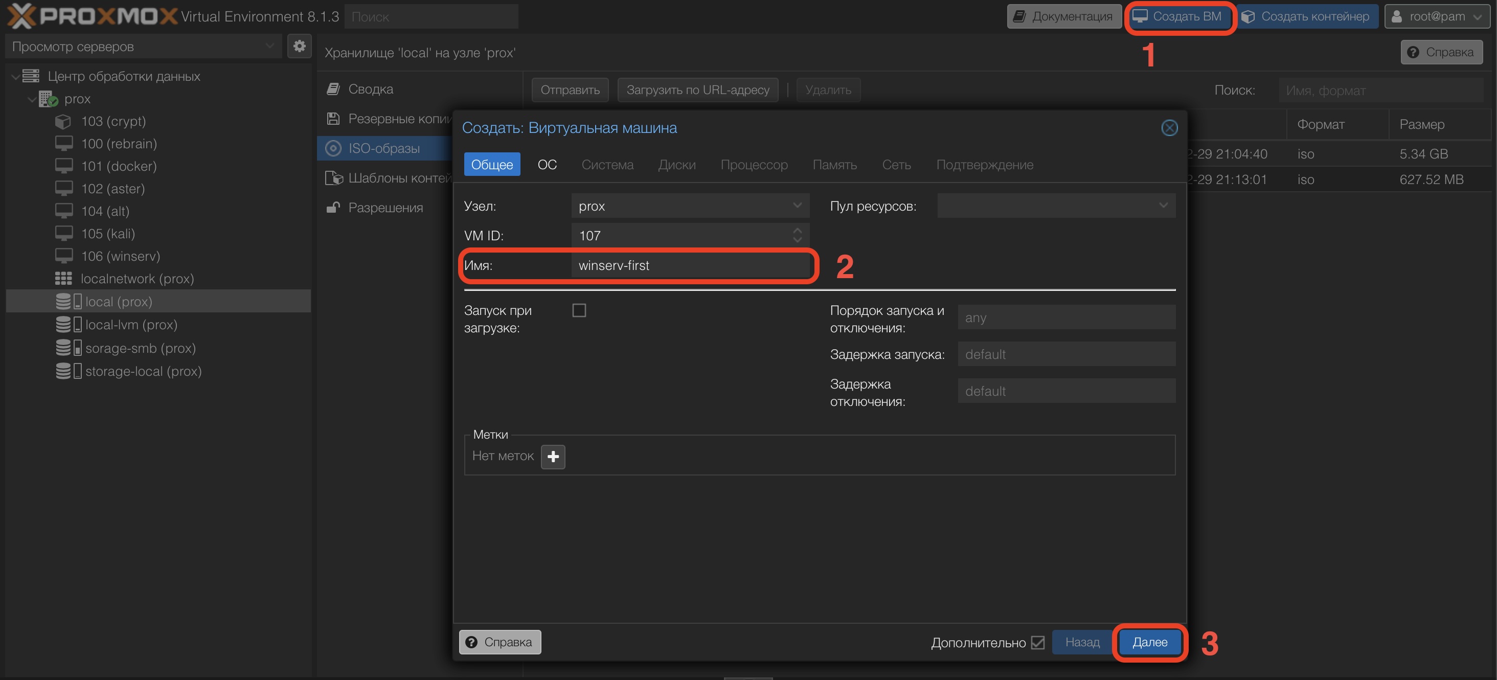 Назовём создаваемую виртуальную машину winserv-first, VM ID - будет заполнено автоматически, но вы можете присвоить любой идентификатор.