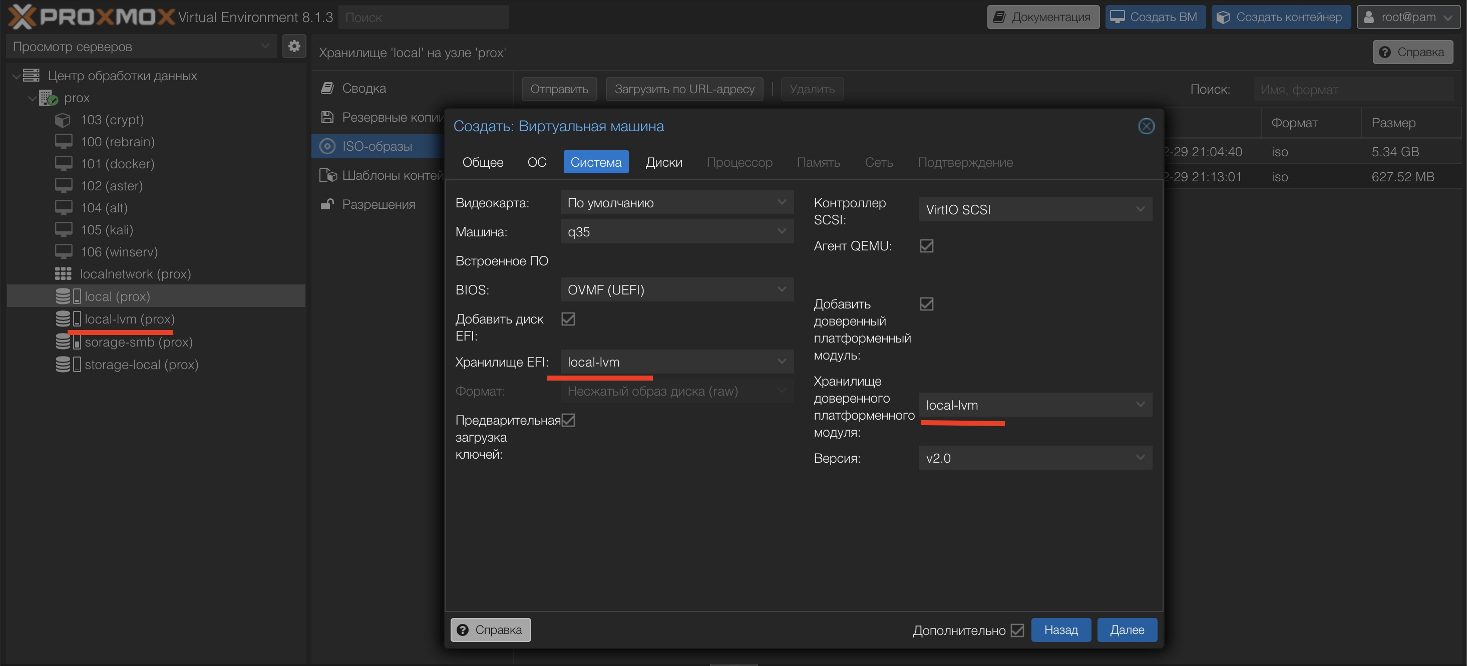 Хранилище EFI и Хранилище доверенного платформенного модуля необходимо выбрать одно из доступных на гипервизоре файловых хранилищ.После того как на вкладке "Система" всё установлено, жмём клавишу Далее и переходим к вкладке Диски.