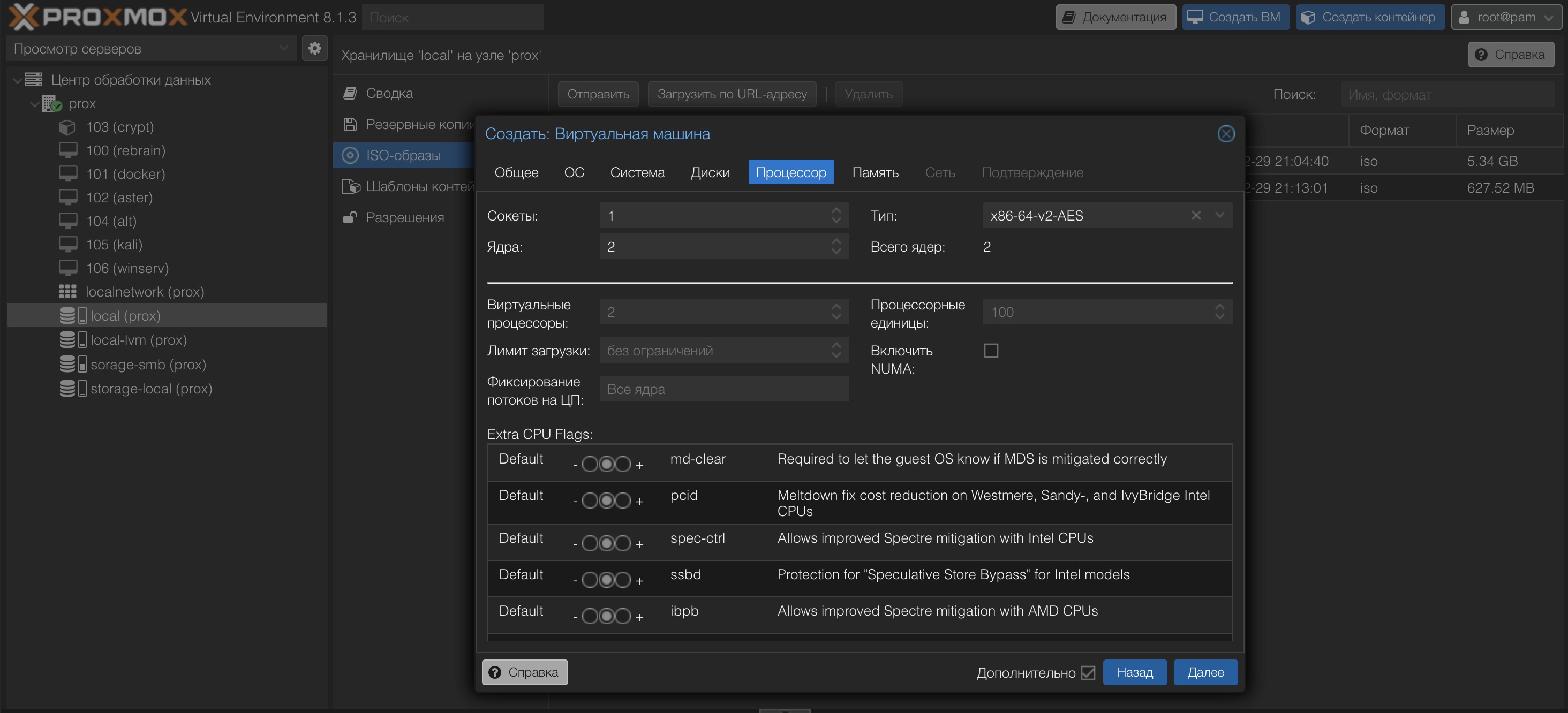 Здесь выставляем Сокеты и Ядра согласно вашим потребностям и возможностям вашего гипервизора. Остальное можно не трогать.